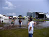 The first wave of severe thunderstorms hit the area around 5:45pm. We could see the clouds gathering but no one expected anything like this. Brian Rademacher and myself retreated to the main press tent just moments before it hit. As the rain begain, the wind picked up to anywhere from 20 to 40 miles per hour, we've been told. The bindings on the tents themselves burst open, the restraining stakes and wooden beams supporting the tent began to buckle and the water flooded in sending everyone heading for shelter.
