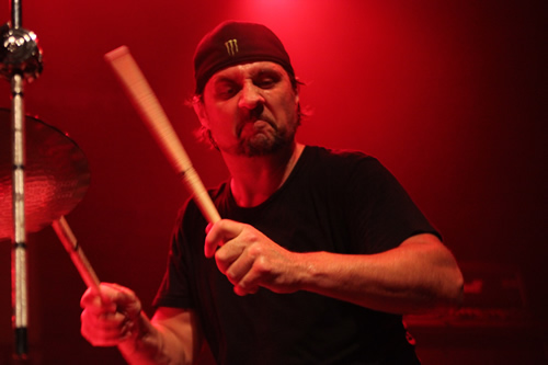 As for the show itself, it truly was an onslaught of heavy metal that did not disappoint at all. To begin the show Dave Lombardo came onto the stage to perform with one guitarist and one bassist (whose names unfortunately escape me). Dave and his other two band mates for the day performed six songs, which although weren't that bad, were nothing like Daves' other band (SLAYER). After Dave left the stage, (oddly not really saying anything), the stage was cleared and prepared for Frank Bello. By meaning "prepared" as in the technical guy placed a bottle of Johnny Walker next to the microphone stand. Frank was obviously starting to get a little inebriated, but this only caused him to talk and interact with the crowd more. Frank mentioned that he had just watched the "Cliff' Em All" video the night before and began playing the intro to the late METALLICA bassist Cliff Burton's bass solo Anesthesia (PULLING TEETH). Beginning to get a bit teary-eyed Frank assured the crowd that if Cliff were still here, he would have been standing next to him right on stage. Frank also said that this clinic was for metal heads everywhere and also mentioned the late "Dimebag" Darryl. Frank then began calling members of the audience up to the stage to help them learn any ANTHRAX bass parts. Upon pulling the first lucky member of the crowd on stage, Kerry King from SLAYER walked on to the stage holding a bottle of Jagermeister. Kerry and Frank both took their shots and Kerry walked off the stage. The first bass line Frank helped the audience member with was for "I am The Law". The kid started to play, but Frank informed him that he was actually playing the guitar part, not the bass part. He then showed him how to play the bass part the correct way, and after a bit of practice, the kid started doing pretty good. After this was done, Frank got another audience member up to the stage who needed help learning the bass part to "Indians". Due to time running short Frank apologized for not being able to call another person up and introduced Billy Sheehan to the stage. When Billy came onto the stage and began playing bass I was absolutely stunned! Say what you will that Billy Sheehan doesn't belong at a Metal clinic but in my opinion Billy deserves to be anywhere the performers are titled as "MASTERS"! While Billy was still performing Frank and Phil Anselmo appeared onto the stage bowing before Billy as he played bass. The three of them then went into "Hot For Teacher" by VAN HALEN, with Charlie Benante from Anthrax backing them up on the drums. Mind you, while Billy was playing all of the guitar parts and solos on the bass also both Frank and Phil were trading the vocals. After they finished they waved to the crowd and exited the stage. Next up was Scott Ian from ANTHRAX who much like Frank was beginning to see the effects of alcohol. Scott explained to the crowd that he would take any questions that they had for him. Not a moment later, loud siren noises started to echo through the theatre, then finally dead air, no sound from Scotts' microphone or any guitar or amp on stage. Scott was still attempting to talk through the microphone, but no noise was heard. Technicians began racing around the stage as Scott stayed on the stage trying to communicate with the audience. Frank returned to the stage carrying a giant megaphone bullhorn to announce that because people were smoking downstairs, the fire alarms started to sound and all power to the stage went off. The crowd began to get a little restless but in about 10 minutes the power was back on and the show could continue. Scott started to joke with the crowd after the power came back on and said that Gene Simmons was downstairs practicing his fire breathing, so that's why the alarms went off. Scott then began calling audience members up to play but stated that he'll play the part first and then the audience member will follow, as he isn't that good of a teacher. The first song played was part of "Skeletons In The Closet". Next was "Madhouse", and the last song Scott played with an audience member was an old S.O.D. song which the mic. cut out when he said the name so I didn't quite get which one it was. Scott took one last question from the audience, being asked "Is the theme music to hell SLAYER"? Scott replied by saying "the devil is not your friend, he wants to fuck with you, so if you are a metal head the LAST thing you're going to hear in hell would be SLAYER. The theme music would probably be something like Arctic Monkeys or something like that". Before he left the stage, Frank came out and announced that because of the technical difficulties, Jagermeister would be giving everyone with wristbands (21 and over) one free shot. Charlie Benante from ANTHRAX came out next and started his drum solo. A member of the audience was already selected to drum with Charlie (they had two full drum sets on stage). They played some solos, going back and forth attempting to out drum what the previous one had just played. After the audience member was done, Dave Lombardo entered the stage. Much like the audience member, Dave and Charlie battled back and forth with some SLAYER drum parts versus ANTHRAX drum parts. The two drummers wrapped it up and exited the stage.