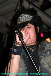 Faster Pussycat was up next but took a bit to set up their stage gear that had netting over their cabinets and skull backdrops on the sides of the stage. The band hit the stage at 12:15 with Taime Downe dressed in a Gestapo style outfit, chain-smoking one after another. He apparently needed some reaction from the Jersey people, and he got it. The band was tight and reeled off many favorites like “Bathroom Wall,” “You're So Vain” and “Shut up & Fuck.” They also played songs from their EP “Power & the Glory Hole” like “Number One with a Bullet,” which will be featured on their upcoming full-length release. Downe really did not move around much, more needing praise and wanted recognition for songs from the past. His vocals were at a premium and did not miss a beat but the action that took place was on the right side of the stage where Michael Thomas did not take a breath, giving the crowd 110% energy. So the balance between nonstop Thomas and laid-back Downe worked the crowd into frenzy, with the chicks in the front bouncing all over the place. The crowd rocked as if I was on a trampoline, and I am surprised any of the photos I took even came out that night.